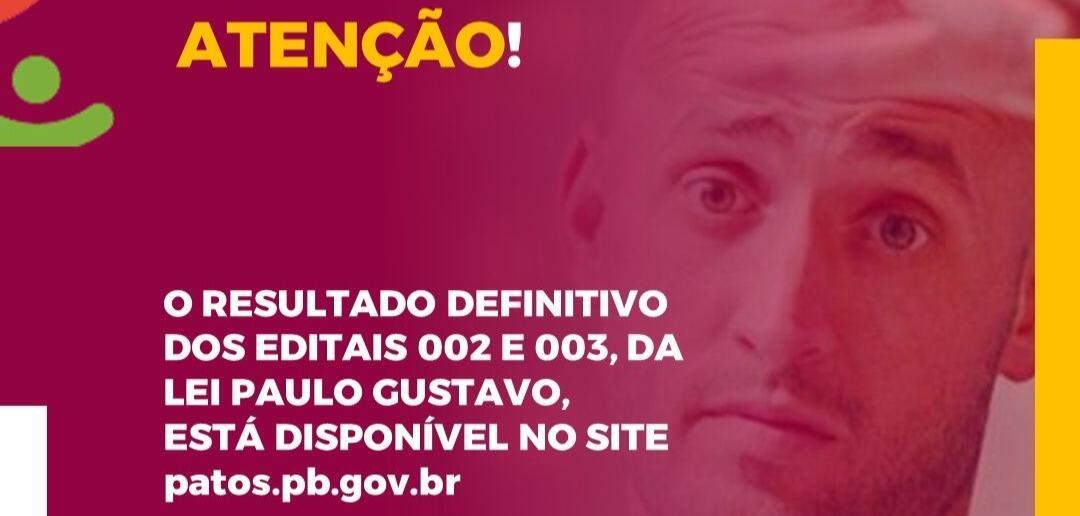 Já estão disponíveis no site oficial da prefeitura municipal de Patos, no endereço eletrônico: patos.pb.gov.br, os resultados dos editais 002 e 003 da Lei Paulo Gustavo, correspondentes ao município.