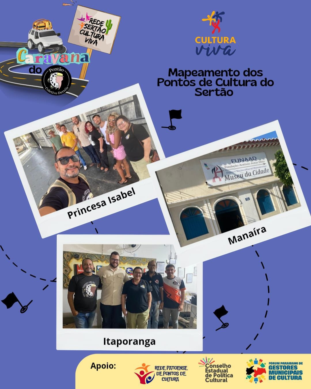 No próximo dia 17 de janeiro em Patos, no Centro Cultural Amaury de Carvalho ocorrerá o 1º Fórum Regional dos Pontos de Cultura do Sertão, um dia de encontro com todos os Pontos e Pontões de Cultura do Sertão da Paraíba, para formalização da Rede Sertão Cultura Viva e eleição dos delegados do Sertão para a 6ª Teia Nacional e 5º Fórum Nacional dos Pontos de Cultura, como também escolher as propostas para a elaboração do Plano Nacional. A Teia Estadual de Cultura Viva, vai ocorrer em Campina Grande, nos dias 26,27 e 28 do próximo mês.