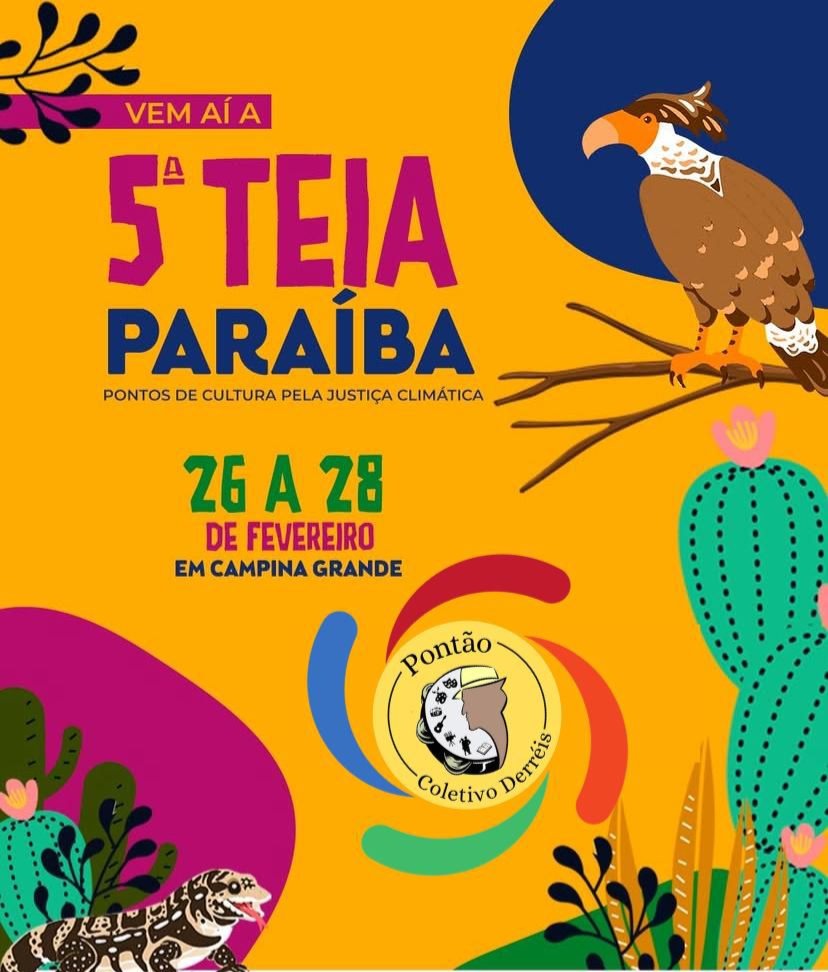 Por meio do Edital nº 035/2025, o Pontão de Cultura Coletivo Derréis realizará entre os dia 26, 27 e 28 a 5ª Teia Estadual dos Pontos de Cultura com tema: "Pontos de Cultura pela Justiça Climática “