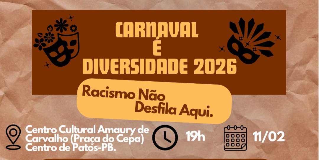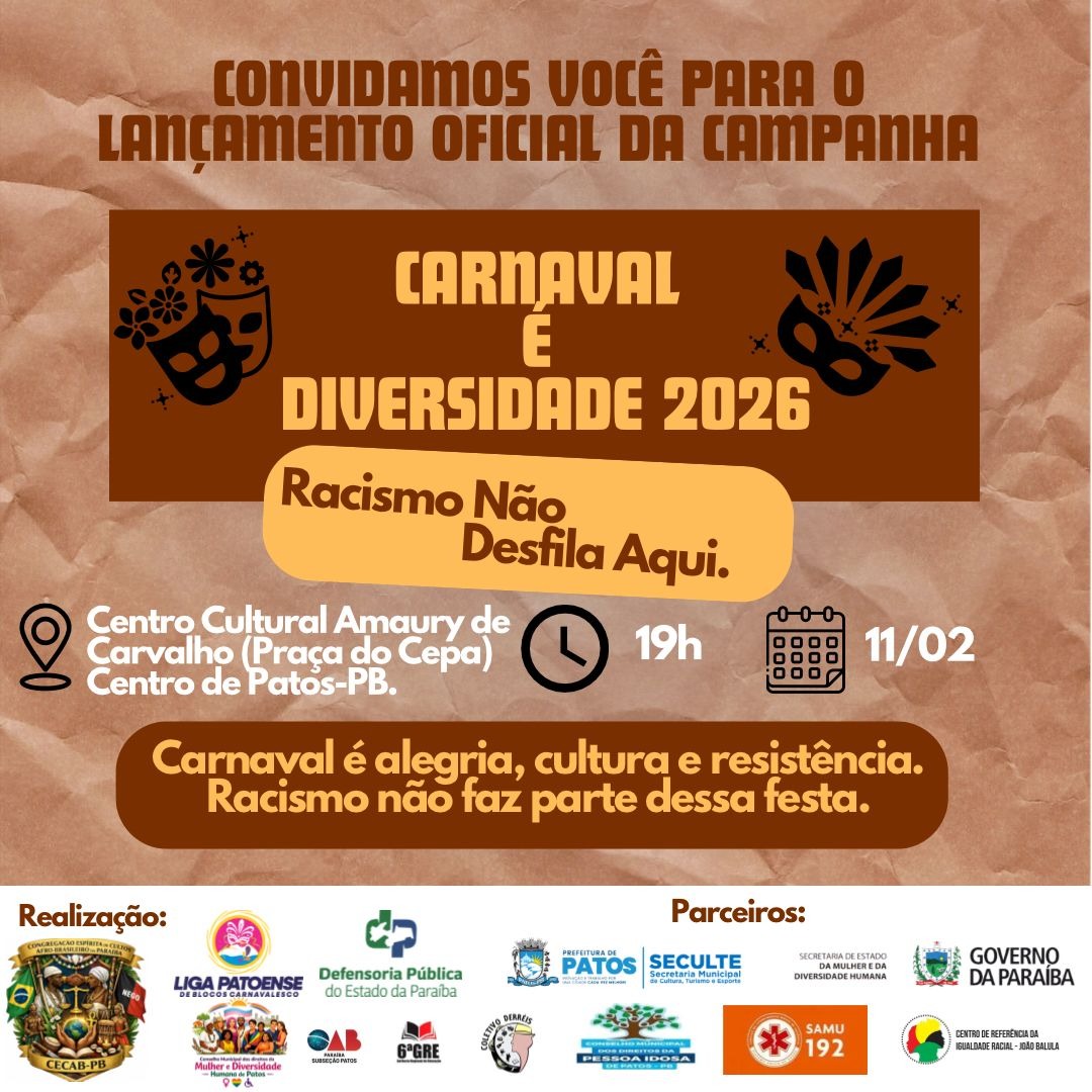 A Coordenadoria Cultural da CECAB-PB tem a honra de convidar toda a comunidade para, no próximo dia 11 (quarta-feira), às 19h, no Centro Cultural Amaury de Carvalho, participar do lançamento da campanha “Carnaval é Diversidade – Racismo Não Desfila Aqui”.