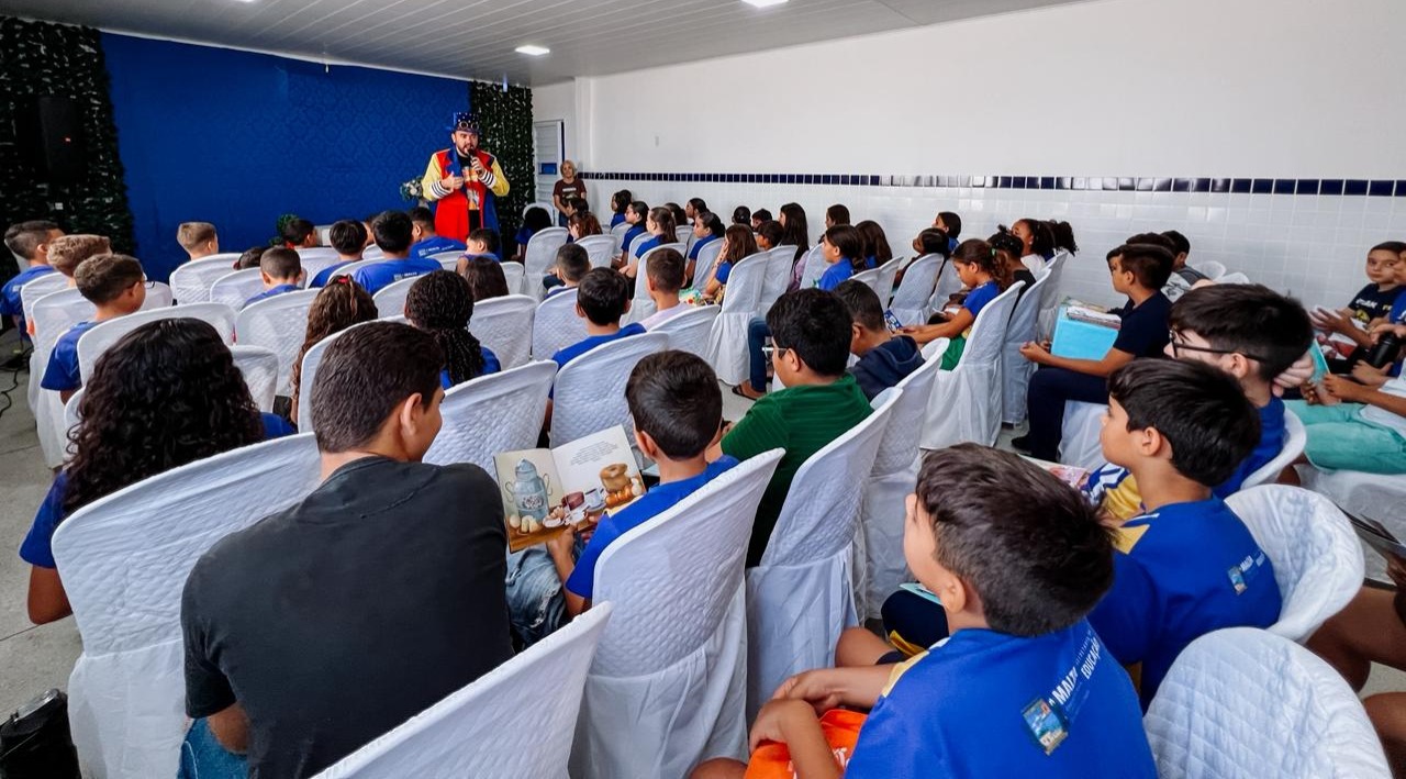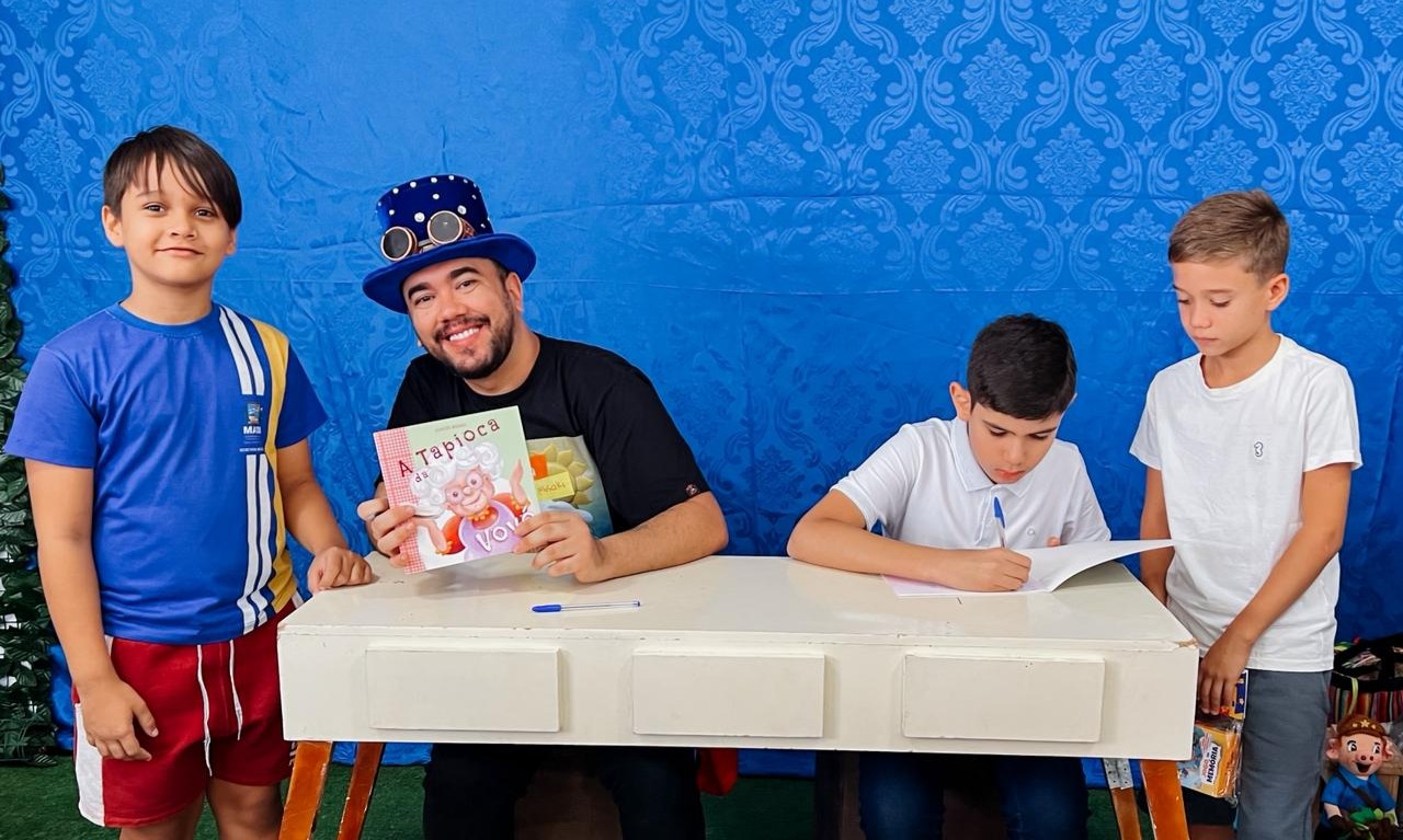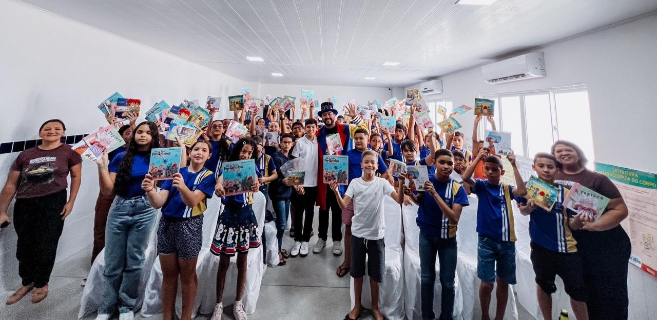 Na manhã desta quarta-feira (12), a Escola Cônego Joaquim de Assis Ferreira promoveu um momento especial de incentivo à leitura e à cultura: a Manhã Literária. A atividade reuniu os alunos dos 5º anos para uma programação repleta de diversão, aprendizado e inspiração, com a presença dos escritores Júnior Misaki e João Miguel. O evento contou com dinâmicas, brincadeiras, leituras compartilhadas e uma animada sessão de autógrafos.