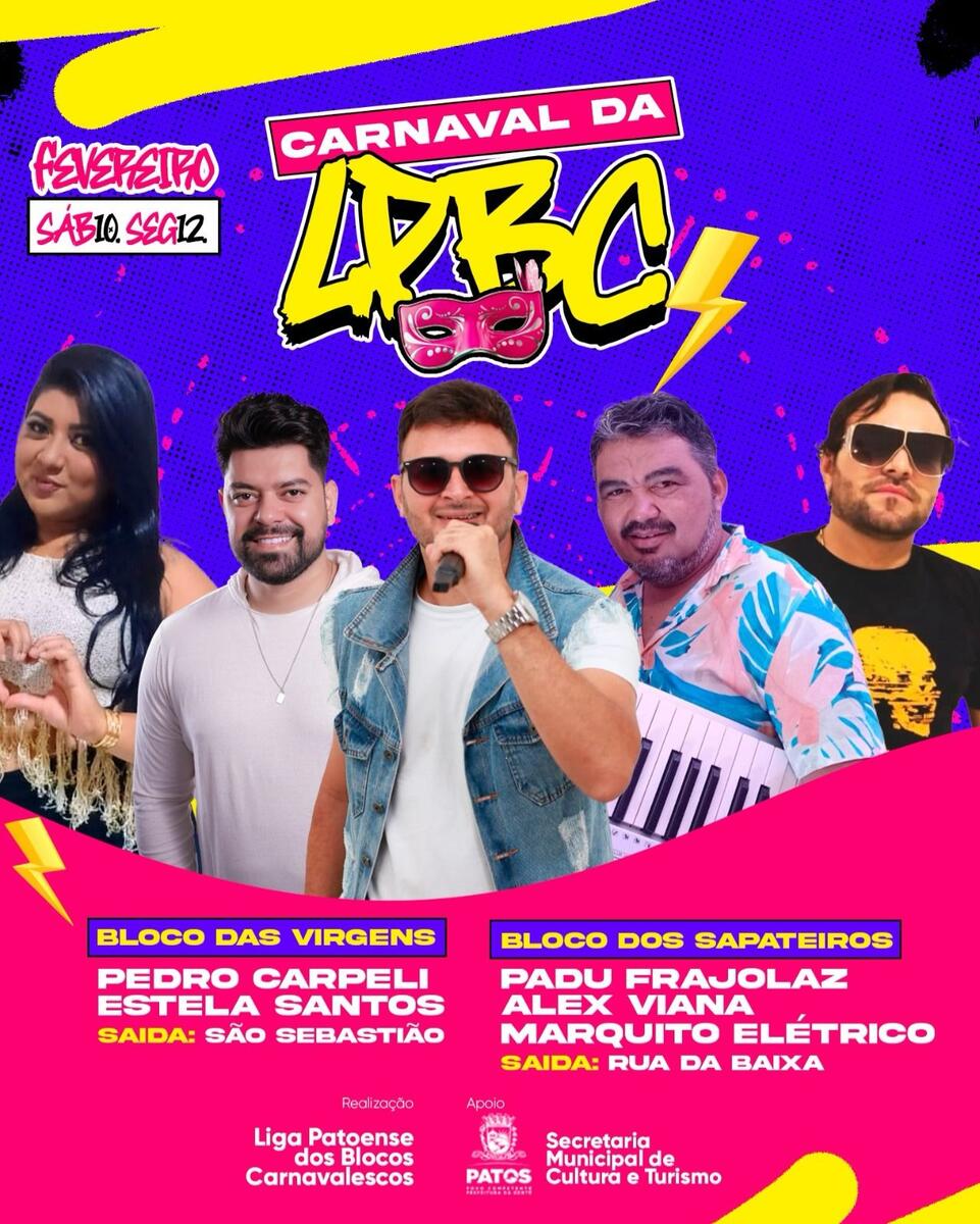 A Liga Patoense de Blocos Carnavalescos anunciou a programação do carnaval deste ano, em Patos. Na abertura, que ocorrerá no sábado, 10 de fevereiro, Pedro Carpeli e Estela Santos puxam o tradicional Bloco das Virgens, saindo do bairro São Sebastião ao centro. O domingo, 11, será voltado para o público infantil. No dia 12, o Bloco dos Sapateiros encerra o carnaval 2024, com Padu Frajolaz, Alex Viana e Marquito Elétrico, saindo da rua da Baixa, no bairro Santo Antônio.