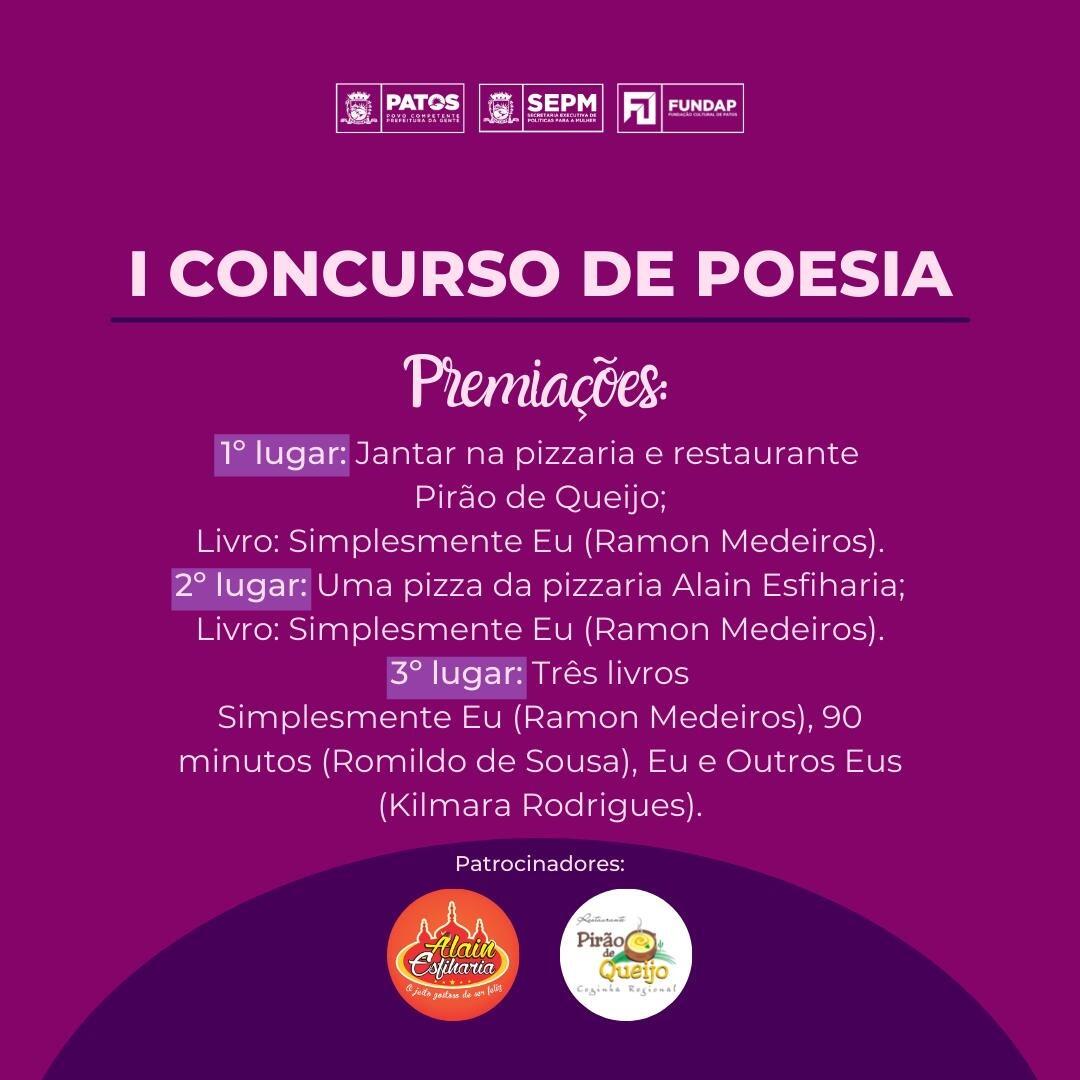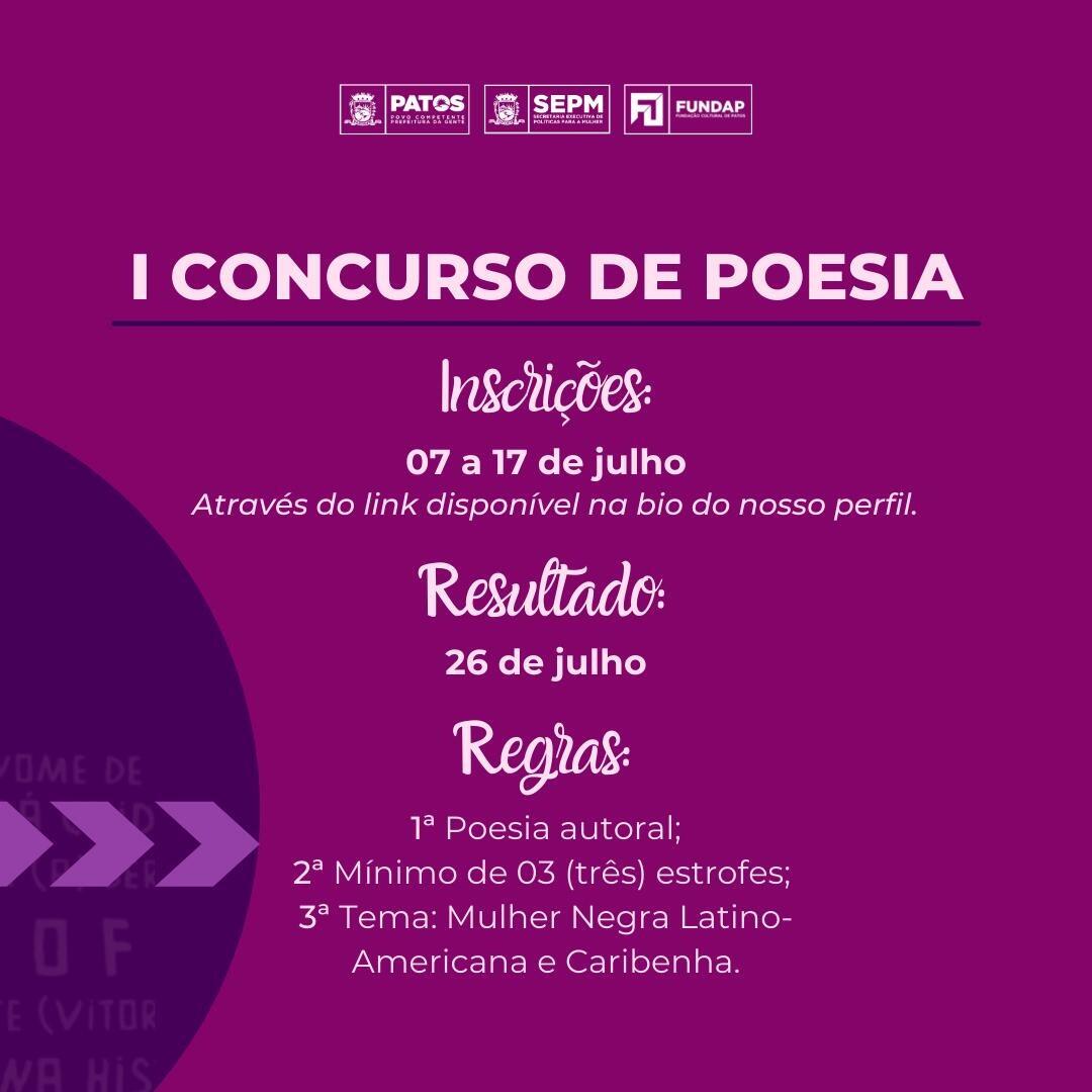 Em comemoração ao "Dia Internacional da Mulher Negra Latino-Americano e Caribenha", a Prefeitura Municipal de Patos, através da Secretaria de Políticas para a Mulher, com o apoio da FUNDAP, realiza o I Concurso de Poesia.