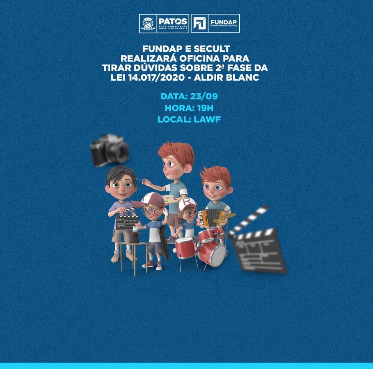 A Prefeitura Municipal de Patos, por meio da Fundação Cultural de Patos - FUNDAP e Secretaria Estadual de Cultura - SECULT, irá promover nesta quinta-feira (23), uma oficina voltada aos artistas e produtores culturais do município que desejam participar e tirar todas as dúvidas sobre os editais da segunda fase da Lei de Emergência Cultural, Aldir Blanc.