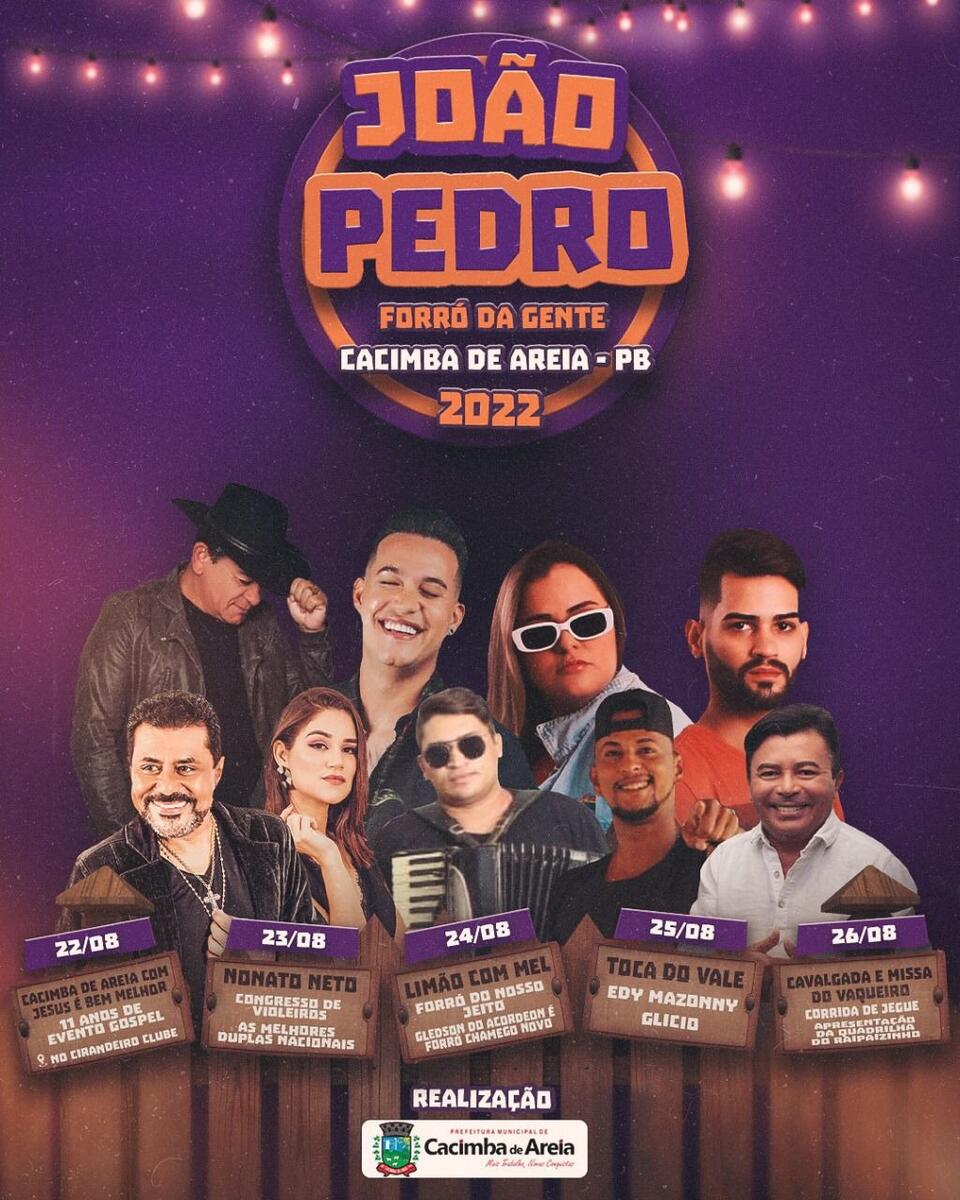 Na manhã deste domingo (31) a prefeitura de Cacimba de Areia-PB, através da Secretaria de Cultura divulgou nos seus canais de comunicação a programação oficial do João Pedro 2022. O evento que por dois anos, devido a Pandemia do Covid-19, não foi realizado, voltará a ter sua edição este ano, na última semana do mês de agosto.