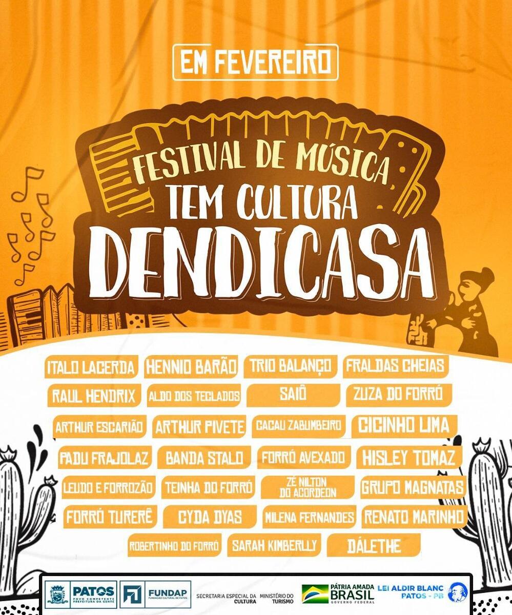 O Festival de Música Tem Cultura Dendicasa está sendo realizado através dos recursos da Lei 14.017/2020 de Emergência Cultura - Aldir Blanc, referente a Chamada Pública 002, publicada no dia 16 de outubro de 2020, por meio da Fundação Cultural de Patos - FUNDAP.
