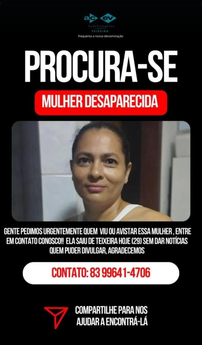A família faz um apelo para que qualquer informação relevante seja comunicada, a fim de auxiliar nas buscas. Quem souber de algo que possa contribuir para encontrá-la pode entrar em contato pelo telefone (83) 99641-4706 ou através da redação do Teixeira em Foco pelo 8399881-8575.
