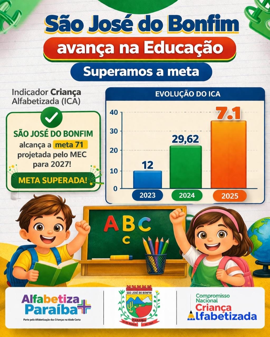 Mais uma grande conquista para a educação de São José do Bonfim. Os novos dados do Índice de Criança Alfabetizada, divulgados pelo MEC, mostram que o município segue avançando e fazendo história. São José do Bonfim alcançou 71% de crianças alfabetizadas na idade certa. Meta projetada pelo MEC para 2027.
