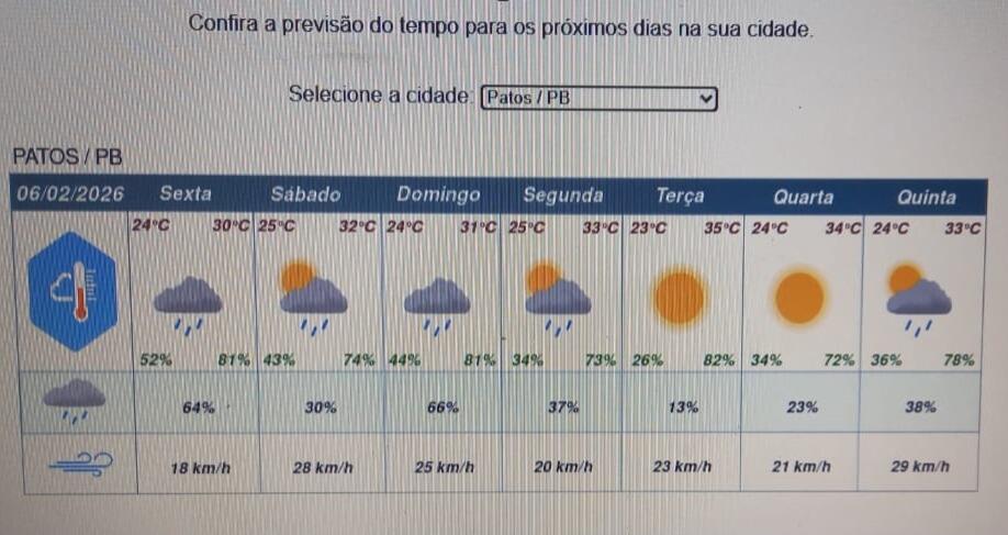 A cidade de Patos está sob alerta de chuvas intensas, emitido pelo Instituto Nacional de Meteorologia (Inmet), que prevê chuvas de até 50mm por dia, com ventos entre 40 e 60 km/h. Outras 156 cidades do estado estão sob o mesmo alerta, a maioria localizadas no Sertão.