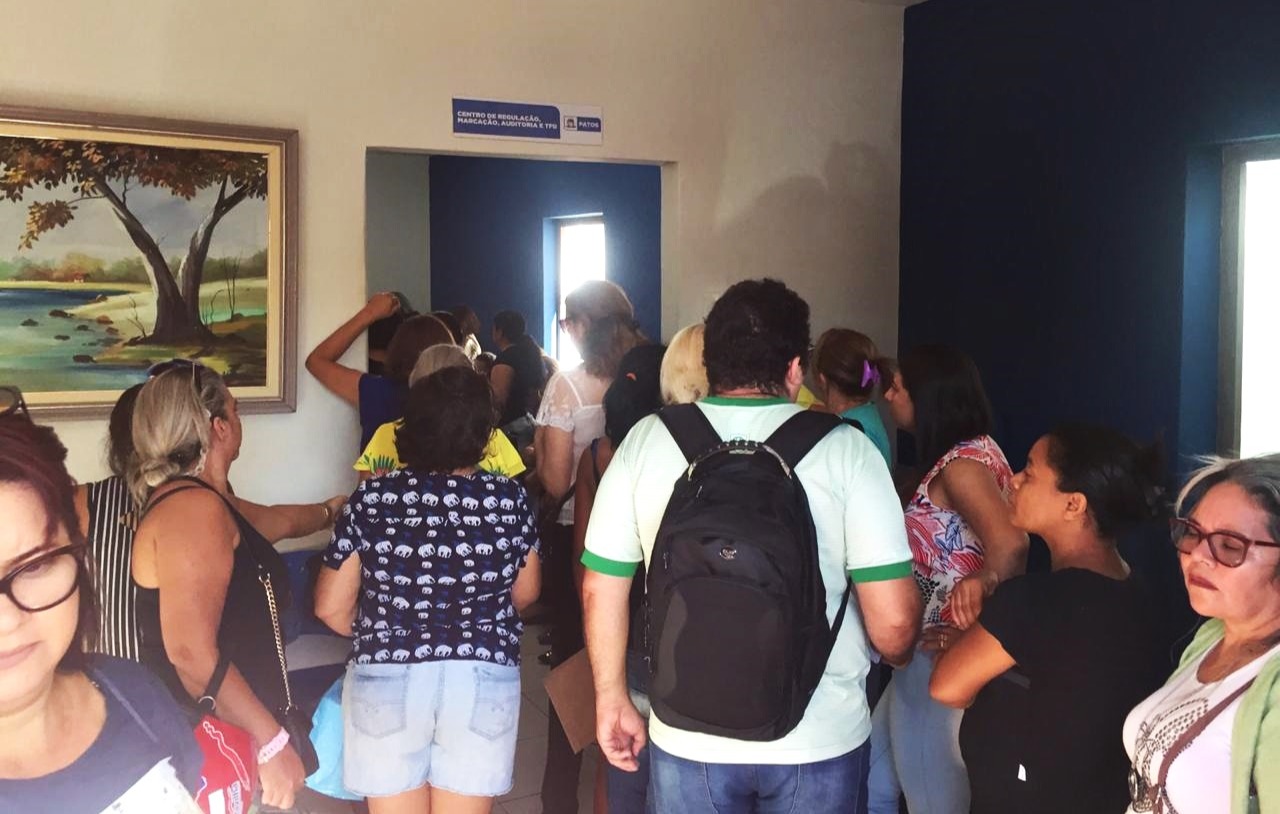 Usuários atendidos pelo serviço da central de regulação e marcação de consultas de Patos, gerenciado pela Secretaria Municipal de Saúde, enfrentaram até três horas de fila na manhã desta segunda-feira (11) para tentar marcar uma consulta médica pelo Sistema Único de Saúde (SUS). Os agendamentos no local foram iniciados às 7h, mas antes das 6h já havia usuários esperando em fila na área externa do prédio.