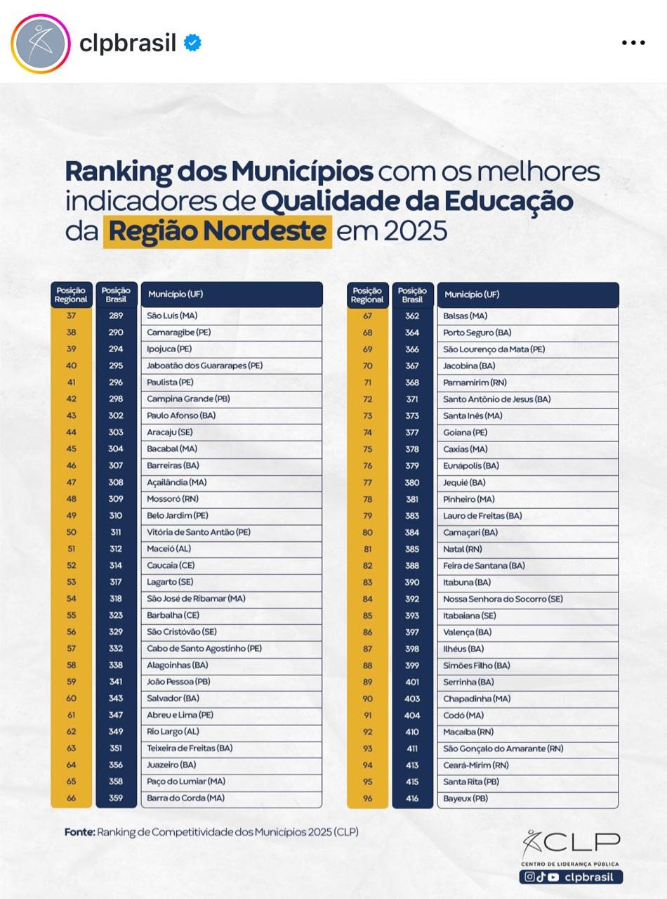 “Municípios que oferecem educação de qualidade formam cidadãos mais autônomos, críticos e preparados para contribuir com o crescimento econômico e social. Sem bons resultados de aprendizagem, o progresso local fica comprometido. Com peso de 6,4% no Ranking, o pilar é essencial para reduzir desigualdades, ampliar oportunidades e garantir o futuro das novas gerações”, comentou um dos organizadores do levantamento.