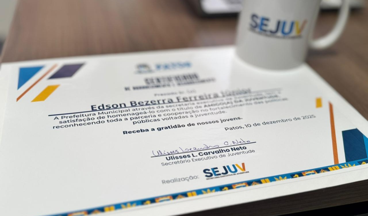 A Prefeitura de Patos, por meio da Secretaria Executiva de Juventude, lançou o Certificado Amigo da Juventude, iniciativa que tem como objetivo reconhecer pessoas e instituições que contribuíram diretamente para o fortalecimento das políticas públicas voltadas à juventude no município ao longo do ano de 2025.