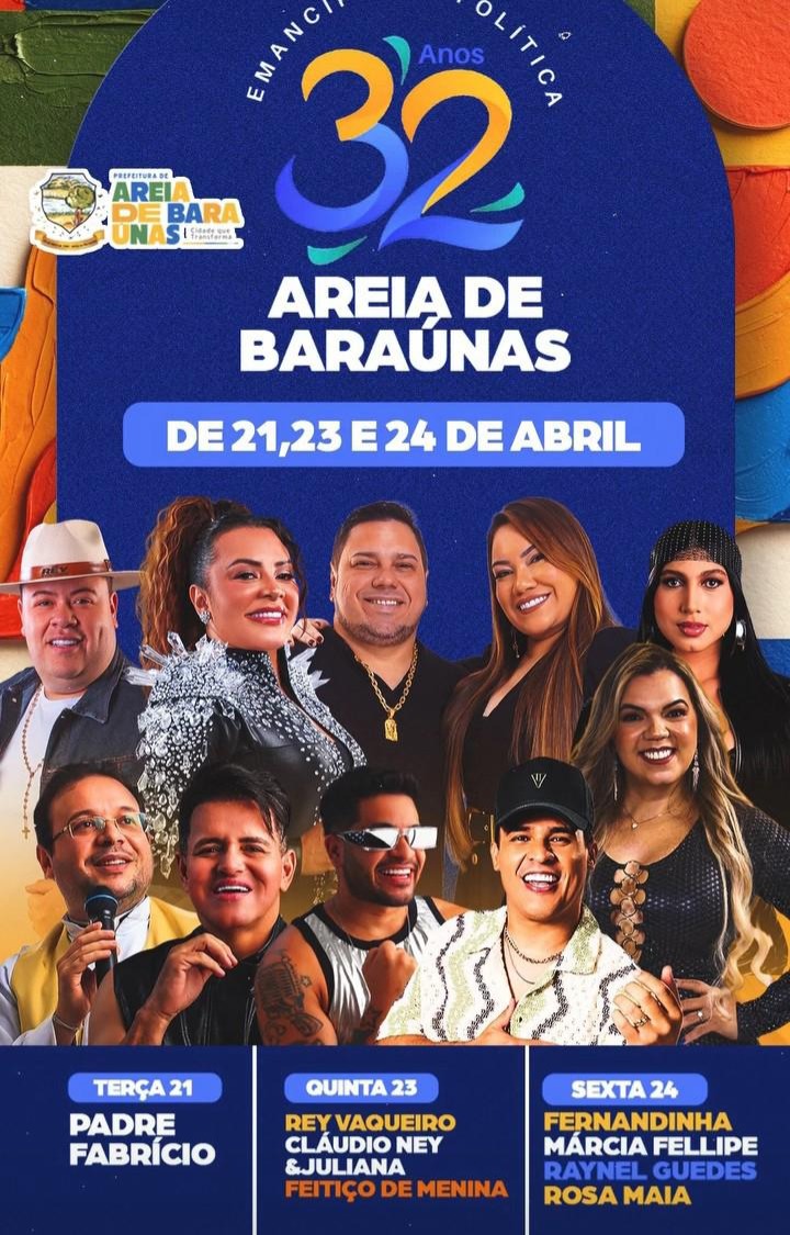 A festa de 32 anos de Emancipação Política de Areia de Baraúnas promete ser uma das mais badaladas de todos os tempos no município e na região.