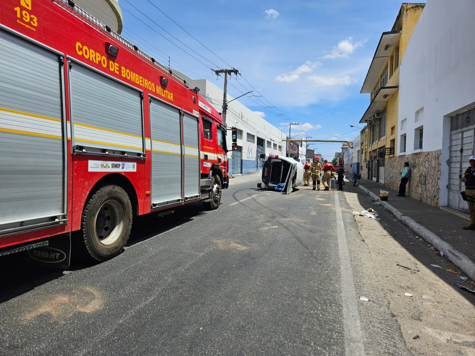 Já o veículo da funerária bateu do hidrômetro dos bombeiros, subiu a calçada, e o motorista que estava acompanhada de outra funcionária, perdeu o controle e o carro capotou na avenida.