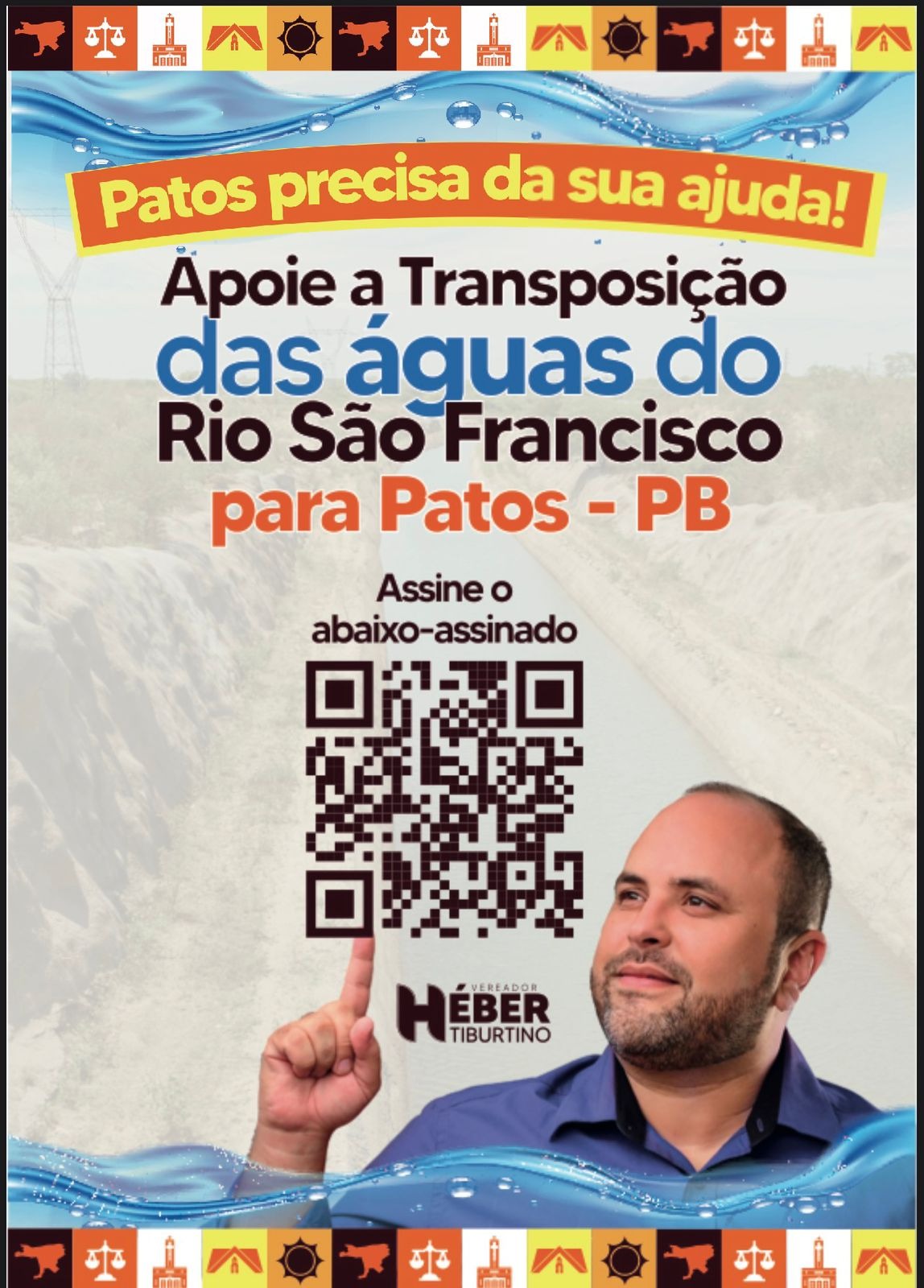 O vereador de Patos, Heber Tiburtino (PP), está encabeçando uma frente pela chegada das águas da transposição do Rio São Francisco ao município de Patos. Com discurso firme e atuação direta junto à população, o parlamentar iniciou um abaixo-assinado que será entregue às autoridades competentes como forma de fortalecer a mobilização em torno da causa.