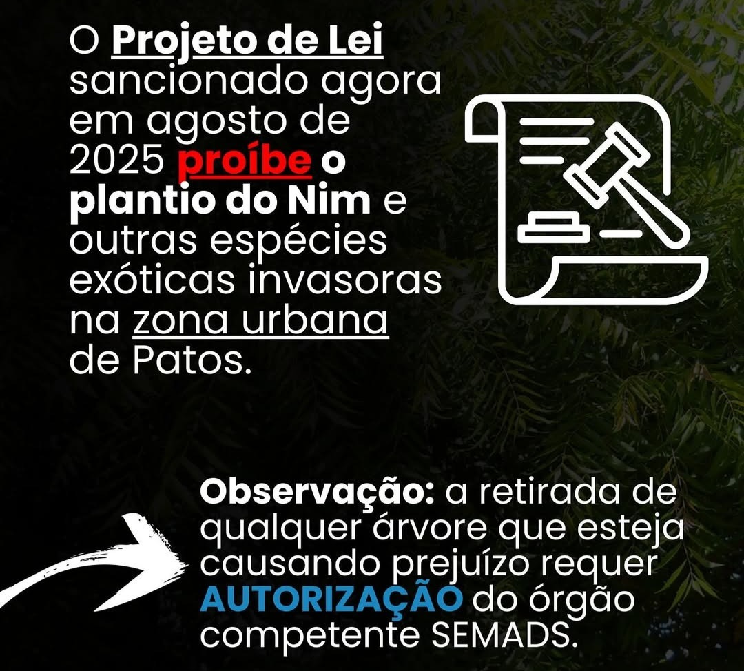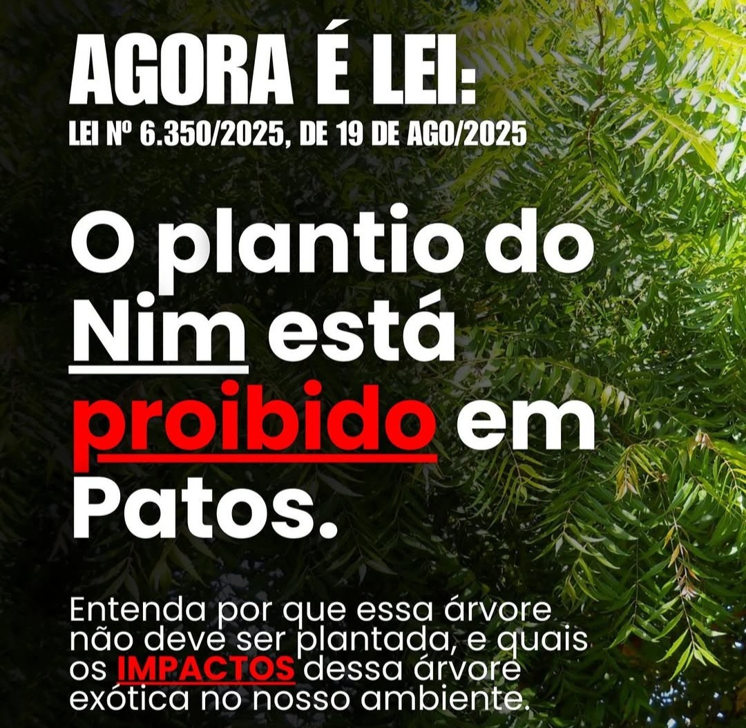 Após tomar conhecimento da entrada em vigor da Lei 6.350/2025 que proíbe o plantio do Nim indiano no município de Patos, a população começou a fazer a erradicação indiscriminada da planta sem acompanhamento do setor competente. O fato vem gerando inúmeros transtornos para Secretaria de Meio Ambiente e Desenvolvimento Sustentável de Patos que tem intensificado ações educativas em torno do assunto.