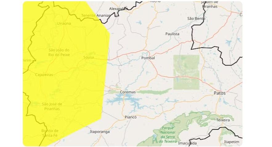 O Instituto Nacional de Meteorologia (Inmet) emitiu, neste sábado (26), um alerta amarelo de perigo potencial de baixa umidade para 31 cidades do Sertão da Paraíba. O alerta é válido até as 22h deste domingo (27).