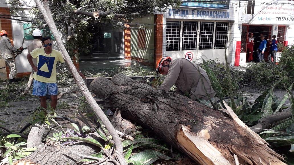 Na Praça do Fórum Bivar Olyntho, no bairro Brasília, uma árvore foi ao chão após a ventania.