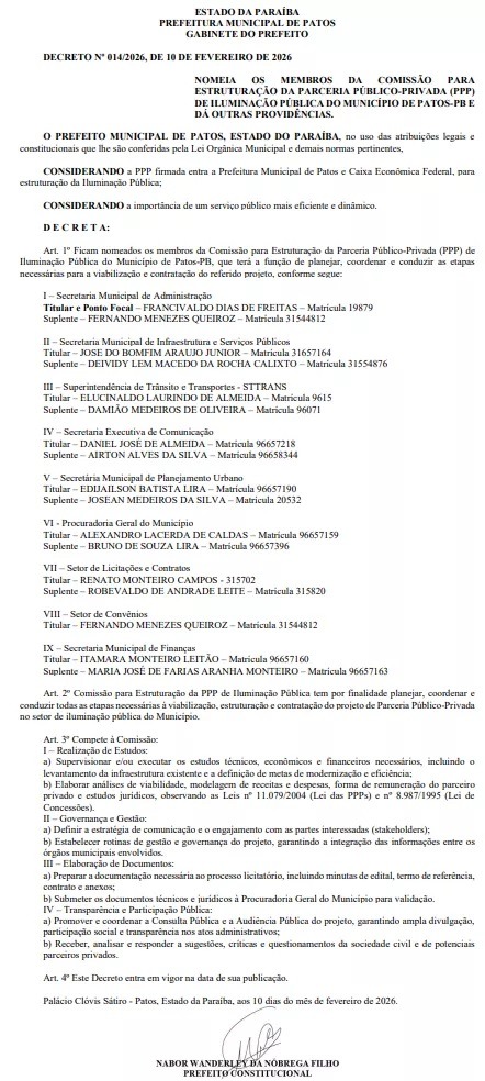 Para tanto, a edilidade publicou, na edição do Diário Oficial do dia 10 de fevereiro, o Decreto nº 014/2026 que nomeia os membros da Comissão para Estruturação da Parceria Público-Privada (PPP) da iluminação pública do município.