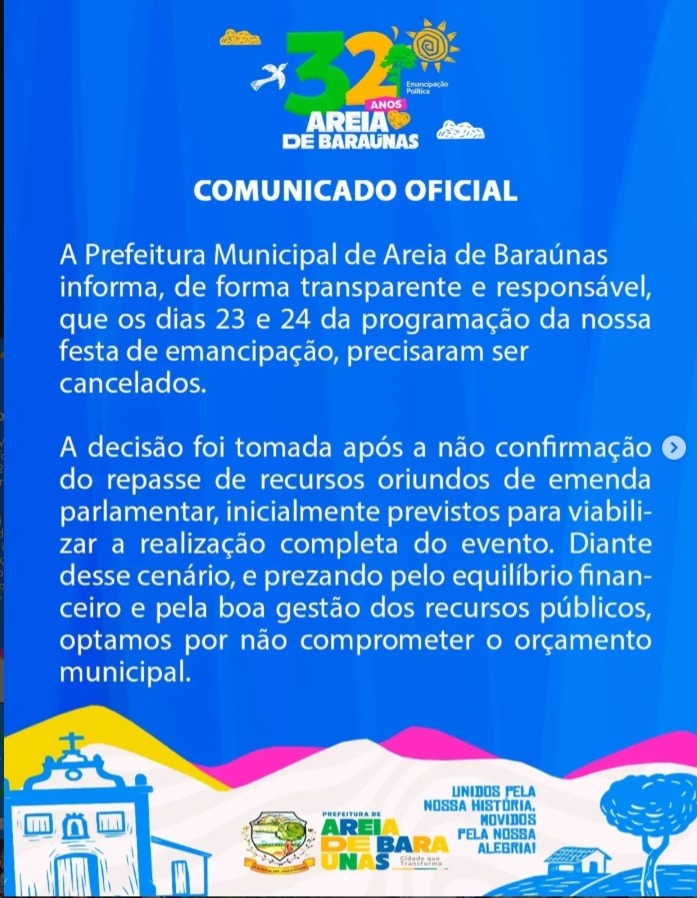 Parte da festa de 32 anos de Emancipação Política de Areia de Baraúnas que aconteceria nos dias 23 e 24 de abril, foi cancelada pela prefeitura nesta quarta-feira (15). A informação foi confirmada pelo próprio prefeito Toinho Macedo que alegou dificuldades financeiras para cumprir todos os compromissos.