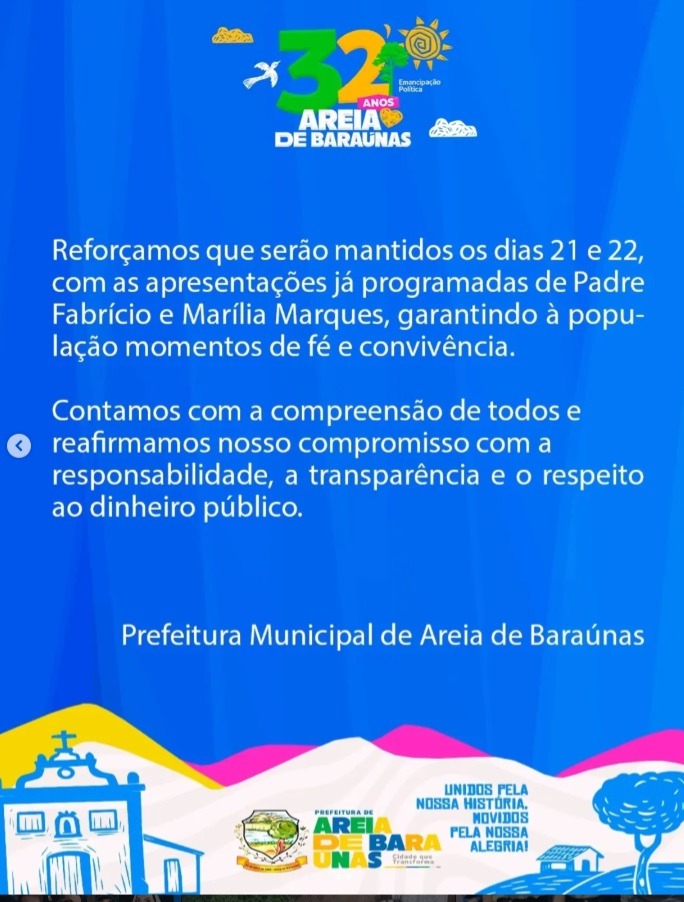Prefeitura cancela shows pelos 32 anos de Areia de Baraúnas, mas mantém celebração de Padre Fabrício