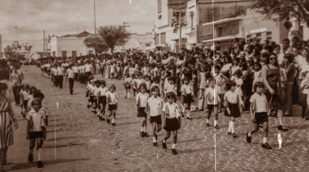 Havia ali uma cidade ansiosa pelos filhos da Ditadura, que, desempenhando o papel para o qual foram “alistados”, adentravam, enfim, o corredor infinito. A rua era toda nossa. Seguíamos, enfileirados, como soldados-meninos, obedientes e disciplinados. Familiares e curiosos punham-se na ponta dos pés para ver a parada cívica de 7 de setembro…
