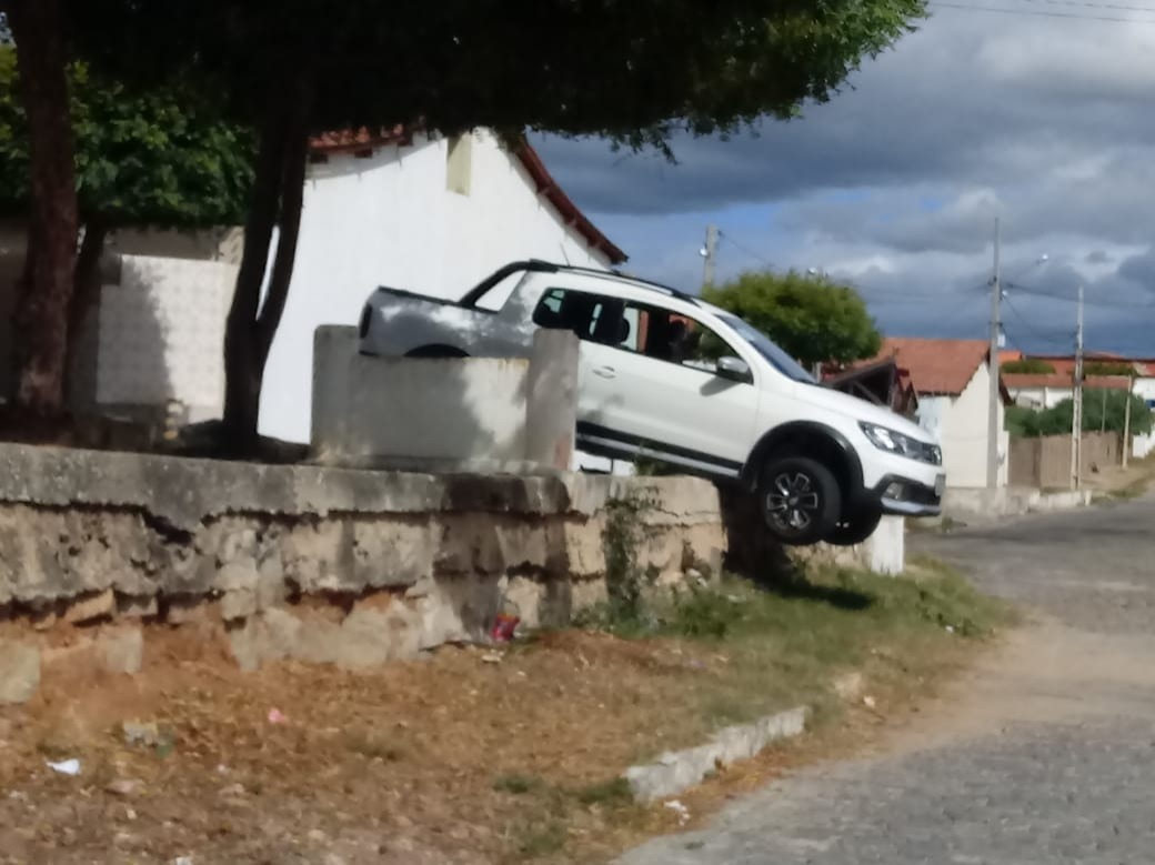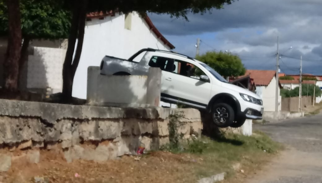 O motorista não foi localizado para explicar como se deu o acidente, mas o fato é que o veículo ficou pendurado como mostra a imagem. Felizmente ninguém se feriu.