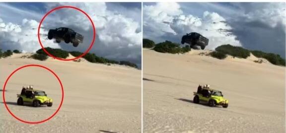 O passageiro contou que o buggy parou na duna para que eles pudessem tirar fotos antes de descer, e momentos depois eles foram surpreendidos pela picape sobrevoando o veículo no qual eles estavam.