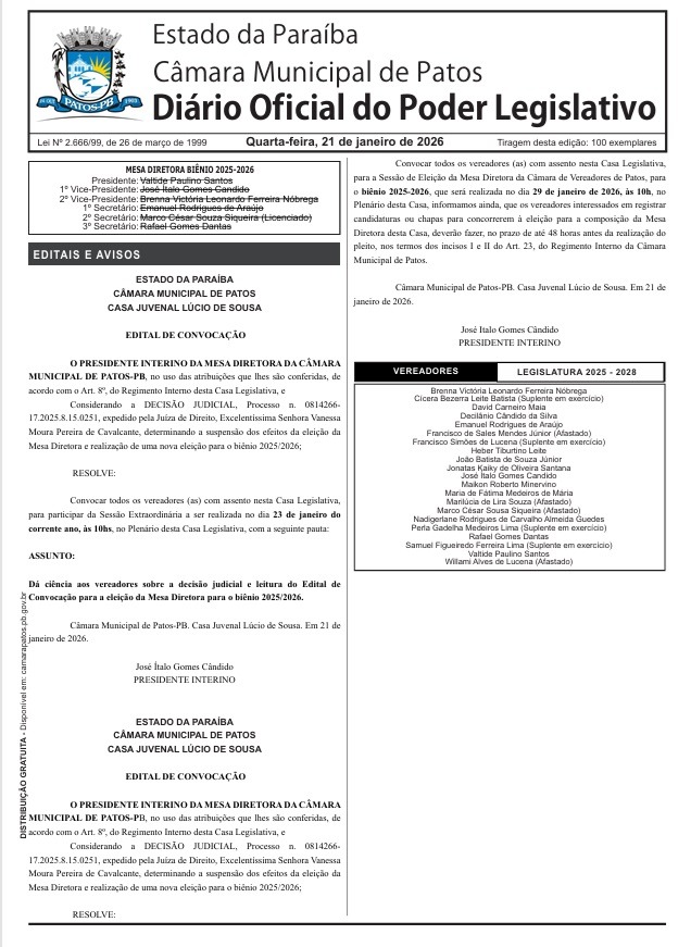 “Convocar todos os vereadores (as) com assento nesta Casa Legislativa, para a Sessão de Eleição da Mesa Diretora da Câmara de Vereadores de Patos, para o biênio 2025-2026, que será realizada no dia 29 de janeiro de 2026, às 10h, no Plenário desta Casa, informamos ainda, que os vereadores interessados em registrar candidaturas ou chapas para concorrerem à eleição para a composição da Mesa Diretora desta Casa, deverão fazer, no prazo de até 48 horas antes da realização do pleito, nos termos dos incisos I e II do Art. 23, do Regimento Interno da Câmara Municipal de Patos”.