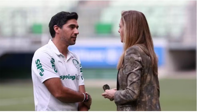 Abel Ferreira e Leila Pereira durante treino do Palmeiras no Allianz Parque — Foto: Cesar Greco