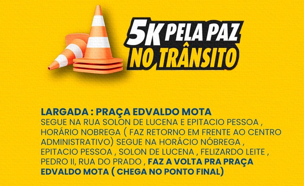 A cidade de Patos será palco, neste domingo, 26 de outubro, da 1ª Corrida pela Paz no Trânsito, um evento promovido pelo DETRAN-PB, em parceria com a Superintendência de Trânsito e Transporte - STTRANS, com o objetivo de incentivar a conscientização, a educação e o respeito no trânsito.
