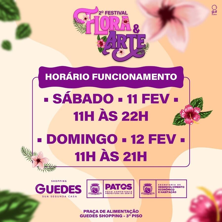 A Prefeitura de Patos, por meio da Secretaria de Desenvolvimento Econômico e Habitação em parceria com o Grupo Guedes, realiza nos dias 11 e 12 de fevereiro, a partir das 11h, a segunda edição do Festival Flora & Arte.