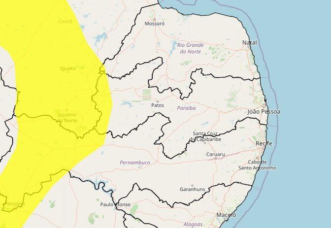 O Instituto Nacional de Meteorologia (Inmet) emitiu um alerta amarelo de Perigo Potencial de Chuvas para 26 municípios do Sertão e Alto Sertão da Paraíba. O aviso tem validade até às 10h desta quarta-feira (3) e indica que pode chover de 20 e 30 mm/h ou até 50 mm/dia na região.