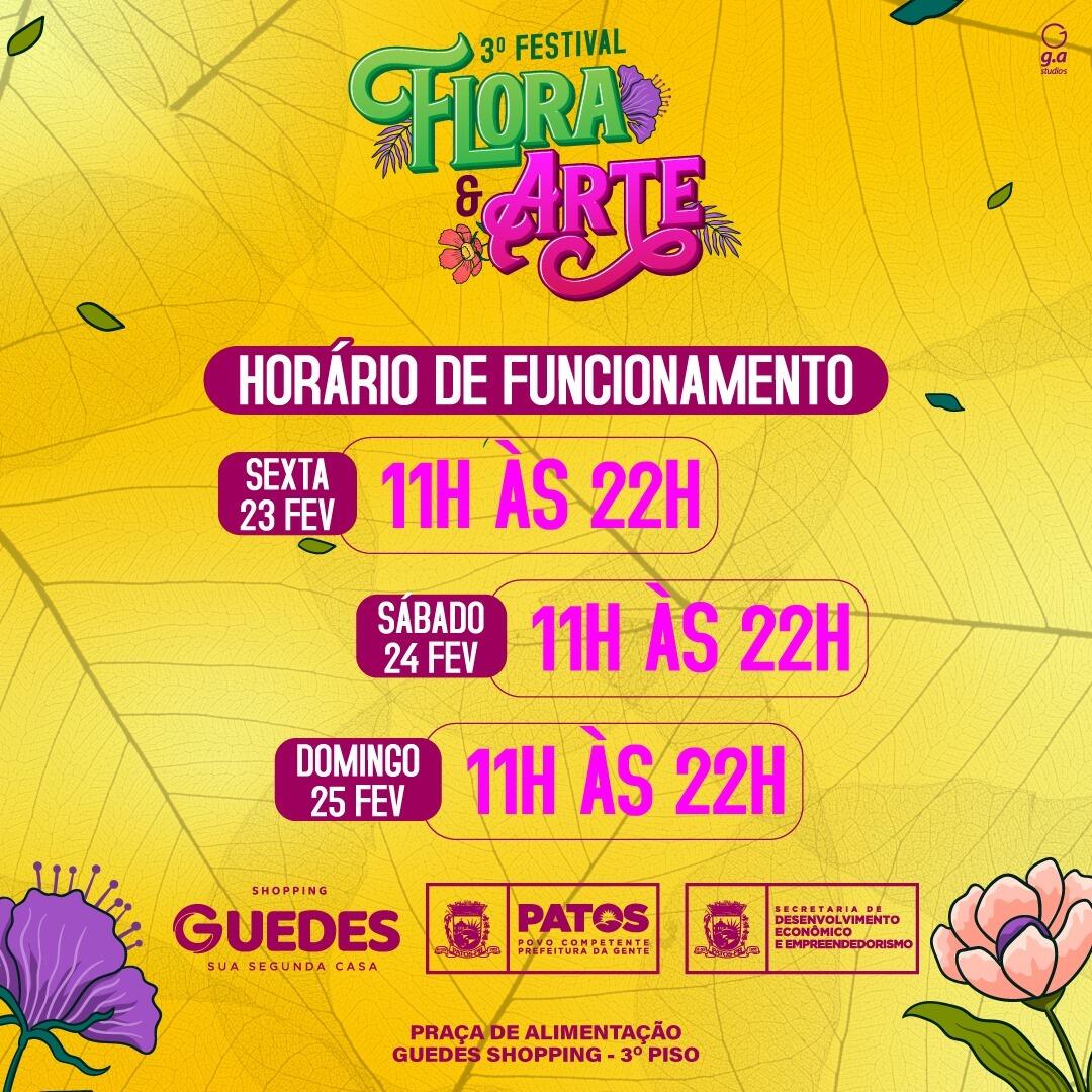 A Prefeitura de Patos, por meio da Secretaria de Desenvolvimento Econômico e Empreendedorismo em parceria com o Guedes Shopping, realiza de 23 a 25 de fevereiro a 3ª edição do Festival Arte & Flora.