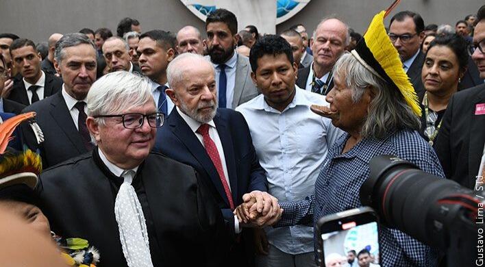 Presidente Lula e o cacique Raoni Metyktire se cumprimentam após a posse. À esquerda, os ministros Herman Benjamin e Luís Roberto Barroso. (Foto: divulgação/STJ)