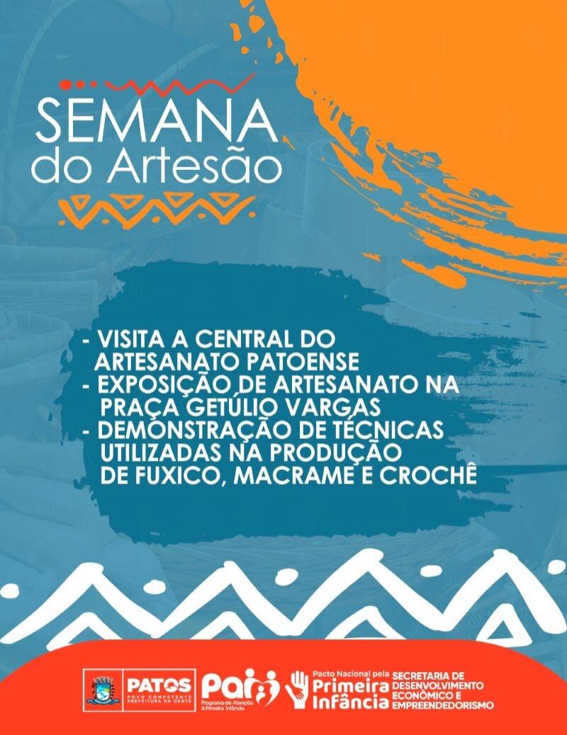 A Prefeitura de Patos, por meio da Secretaria de Desenvolvimento Econômico e Empreendedorismo, realiza de 18 a 22 de março a Semana do Artesão, que tem o seu dia comemorado no dia 19 de março. O evento contará com exposição de artesanato, oficinas de fuxico, macramê e crochê.