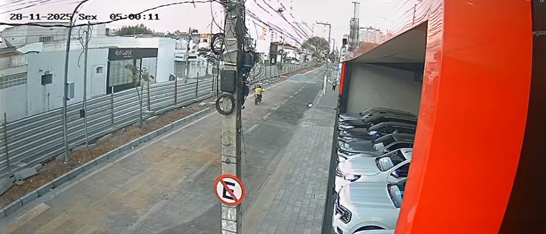 Sem observar o monte, ele ainda guiou sua moto por alguns metros, como mostram câmeras da avenida, e acabou colidindo com o monte de pó de brita que está lá para obras do canteiro central.