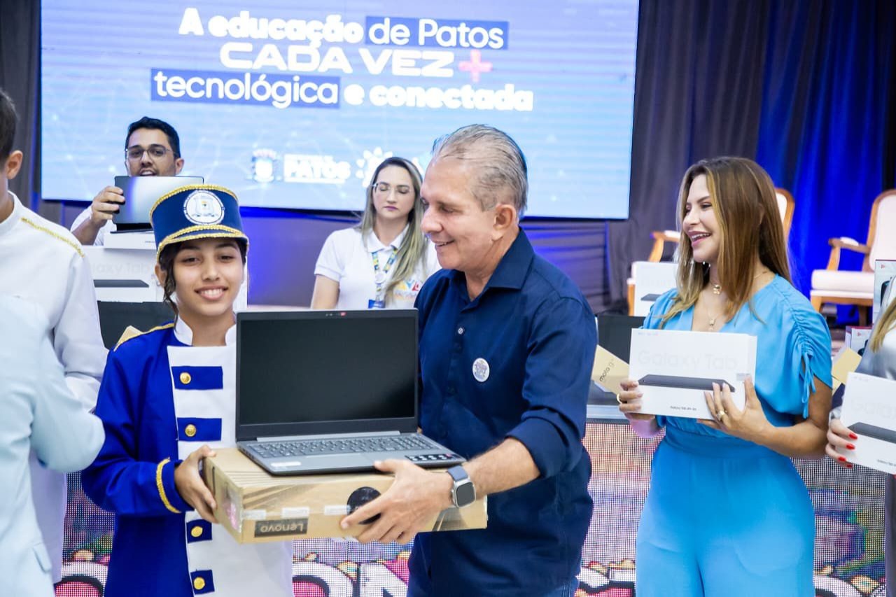 A Prefeitura de Patos, por meio da Secretaria Municipal de Educação, lançou na noite desta terça-feira, 14 de outubro, o Programa Aluno Conectado, durante uma solenidade especial em comemoração ao Dia do Professor. O evento aconteceu no Patos Walter Play e reuniu diretores, professores, coordenadores pedagógicos, além do prefeito Nabor Wanderley, do vice-prefeito e professor Jacob Souto, e da secretária de Educação, Adriana Carneiro.