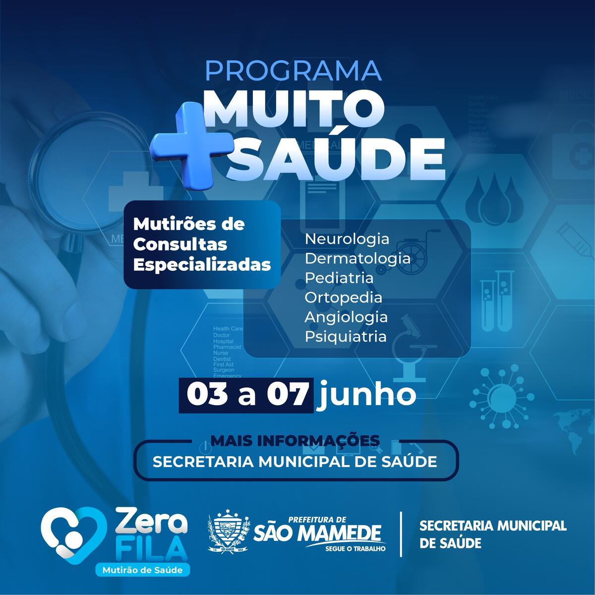 A Prefeitura de São Mamede, por meio da Secretaria de Saúde, realiza entre os dias 03 e 07 de junho, mutirão de consultas especializadas, exames e cirurgias dentro do programa “Muito Mais Saúde”. O objetivo é reduzir ao máximo o tempo de espera e implementar um novo modelo de assistência.