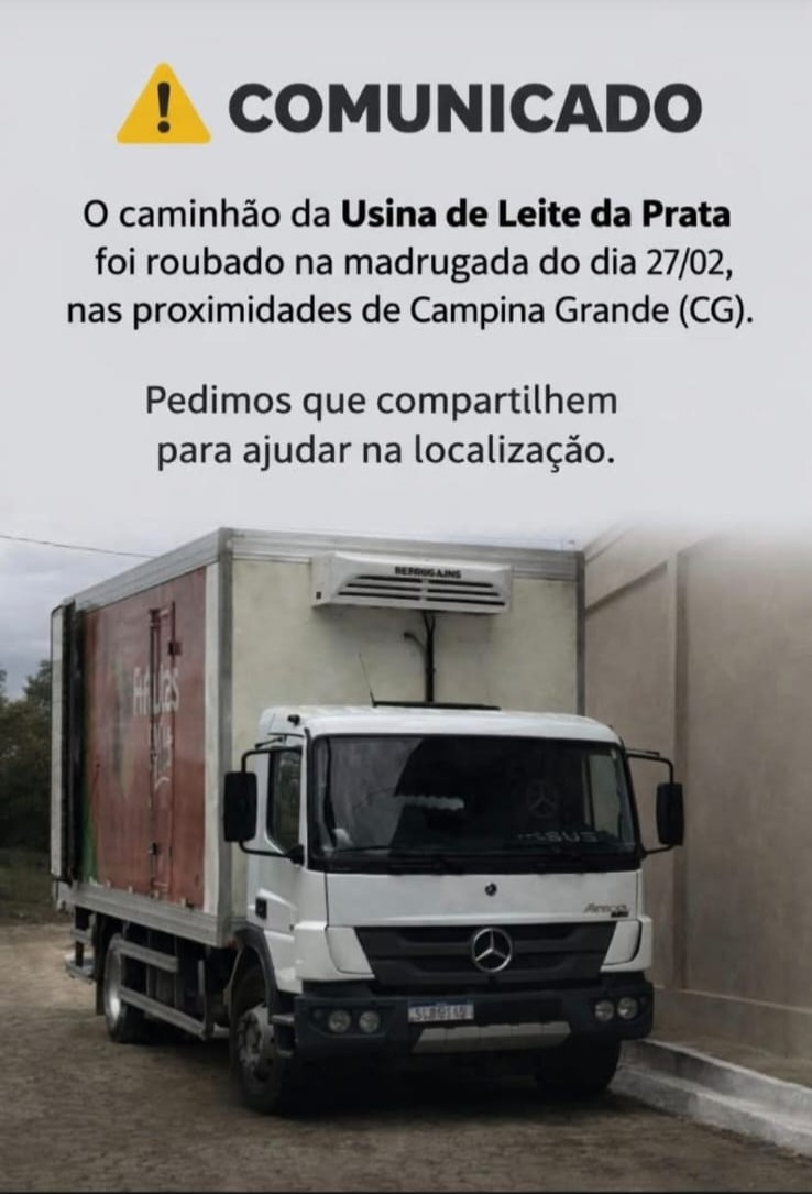 O caminhão baú, pertencente a Usina de Leite de Cabra da Prata-PB, modelo MD 1479 da Mercedes Bens, foi roubado na manhã desta sex-feira (27) na rodovia já próximo a Campina Grande-PB.