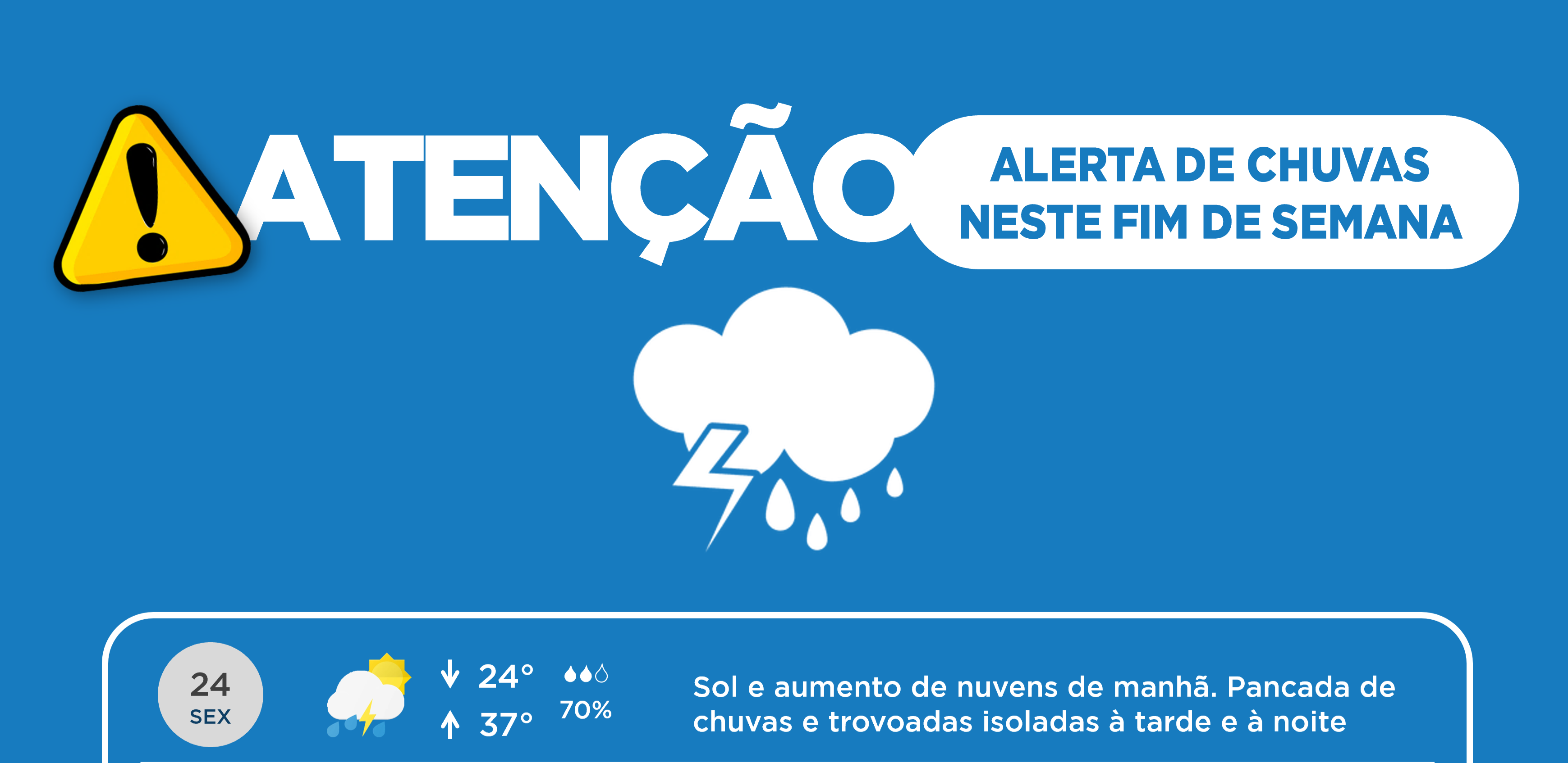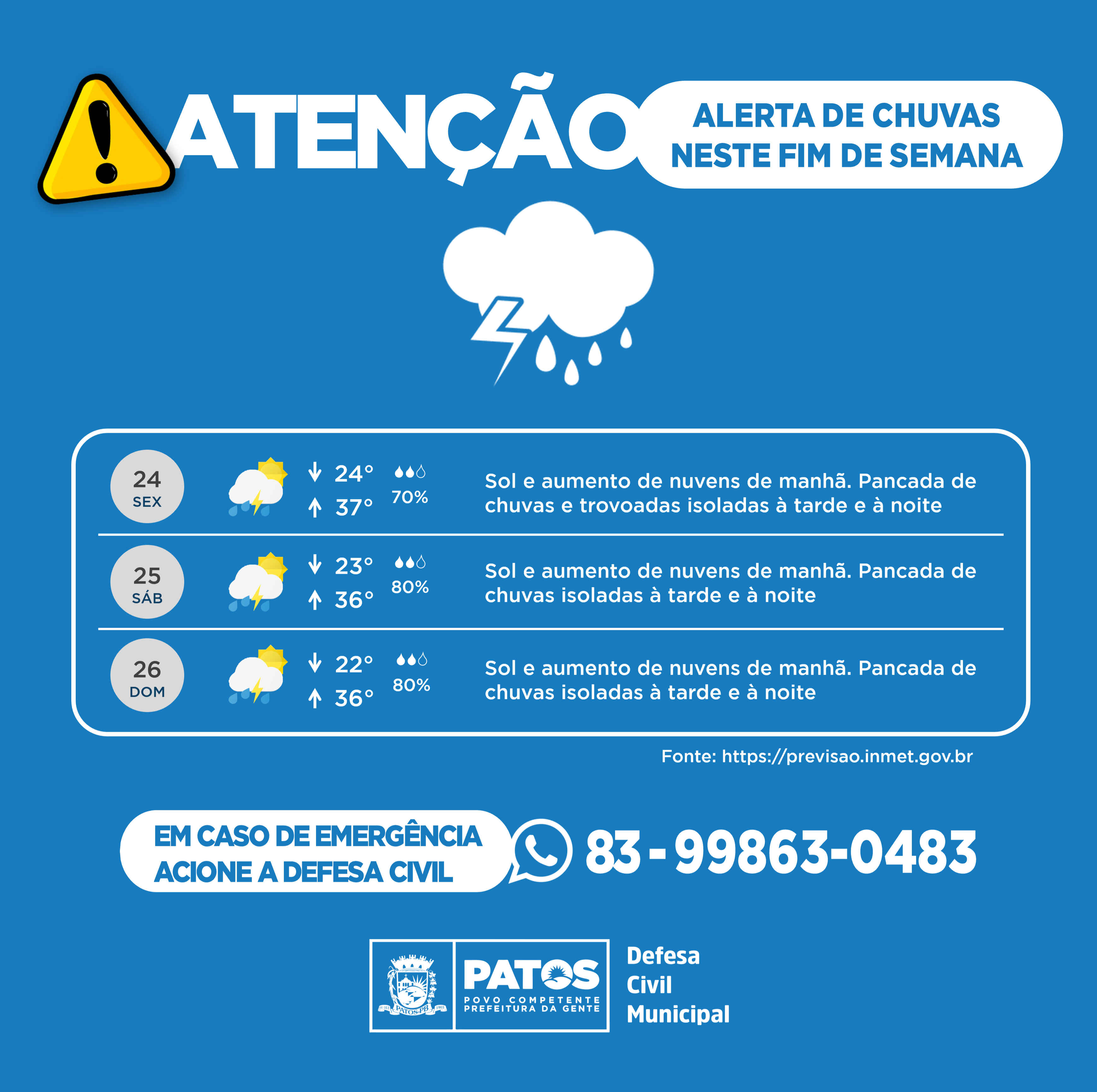 O coordenador da Defesa Civil do Município, Josimar Barbosa, traz alerta repassado pelo Instituto Nacional de Meteorologia - INMET, tratando de novas chuvas para este fim de semana, principalmente no período da tarde, podendo se estender durante a noite.