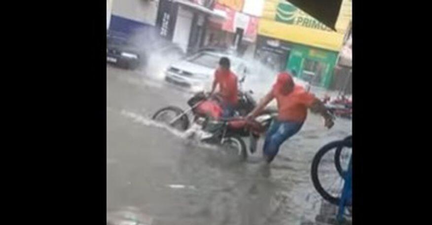 A chuva intensa durou cerca de quatro horas, alguns estragos foram registrados. É possível ver o desespero dos proprietários que tentam retirar as motos que são arrastadas pela força das águas.