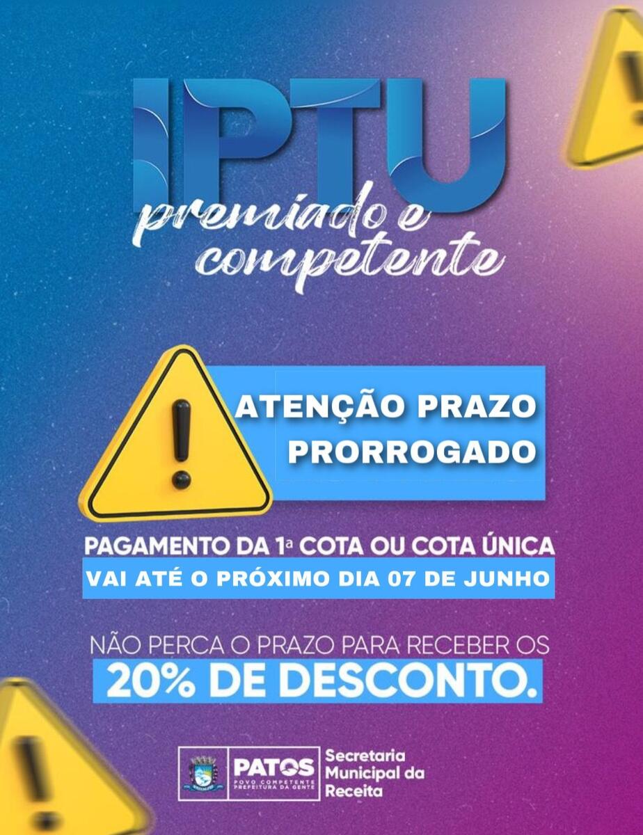A Prefeitura de Patos informa aos contribuintes que o prazo para pagar o IPTU com 20% de desconto foi prorrogado até a próxima quarta-feira, 07 de junho.