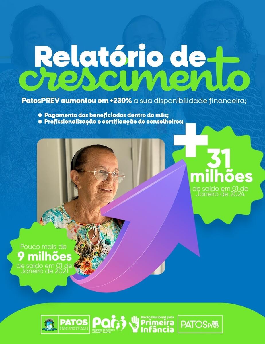 Em janeiro de 2021, o PatosPREV tinha como saldo um montante de pouco mais de 9 milhões de reais, e entra em janeiro de 2024 com saldo superior a 31 milhões e 500 mil reais em caixa.