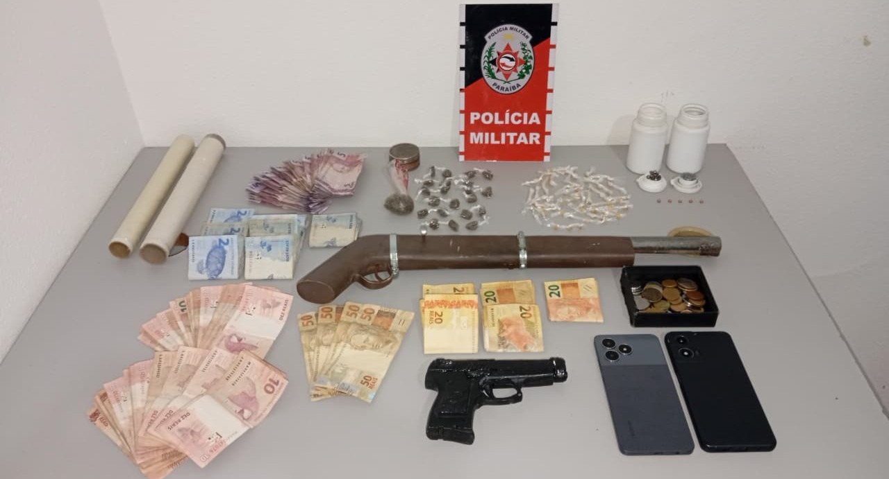 Durante a varredura, os militares localizaram uma espingarda calibre 12, de fabricação artesanal, uma pistola simulacro, além de substâncias entorpecentes análogas a maconha, cocaína e crack, embaladas e prontas para comercialização. Também foram apreendidos R$ 1.553,70 em espécie, balanças de precisão, embalagens plásticas e outros materiais comumente utilizados no tráfico de drogas.