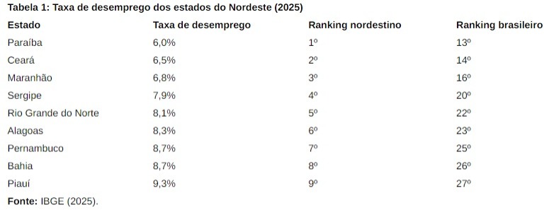 Um dado que merece destaque é o desempenho da Paraíba, que aparece como o estado nordestino com a menor taxa de desemprego em 2025, alcançando 6,0%, segundo o IBGE. Esse resultado coloca o estado em posição relativamente favorável no contexto regional e em posição mediana no ranking nacional. A Paraíba, seguida por Ceará e Maranhão, compõe o grupo dos estados com menores taxas de desemprego da Região, entre 6,0% e 6,8%, apresentando níveis mais próximos da média nacional (5,6%).