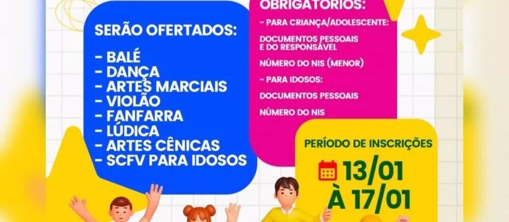 As oficinas oferecidas contemplam diversas áreas de interesse, como ballet, dança, arte, música (violão), fanfarra, atividades lúdicas, artes cênicas e SCFV (Serviço de Convivência e Fortalecimento de Vínculos) para idosos. Aproveite a oportunidade para se envolver em atividades culturais e sociais no município!