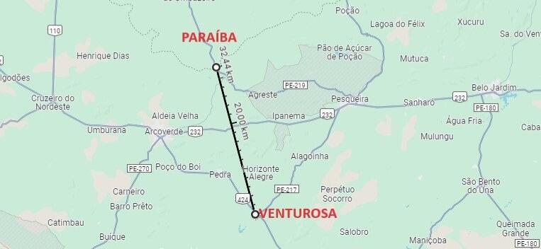 Mapa abaixo mostra distância entre Venturosa e a Paraíba: