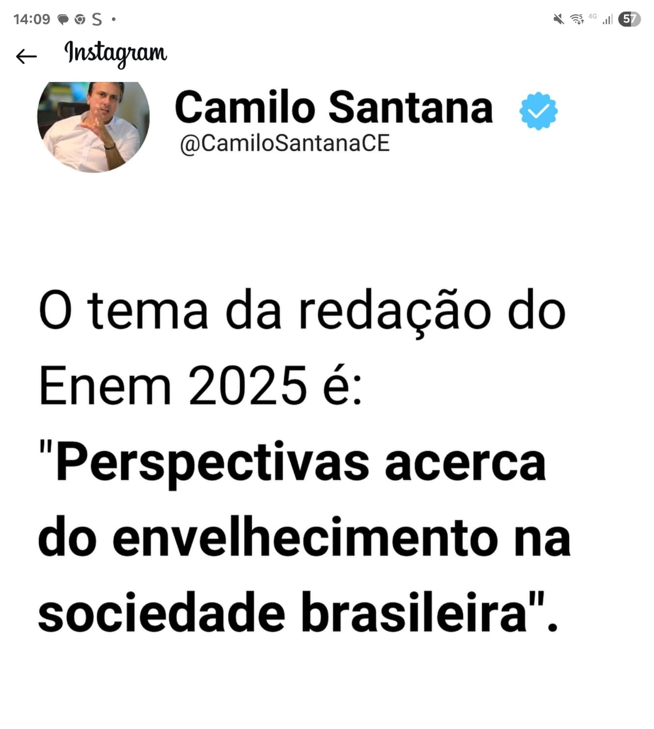 O ministro da Educação, Camilo Santana, divulgou o tema da redação do Exame Nacional do Ensino Médio (Enem) 2025 através das redes sociais neste domingo (9). Os estudantes terão que escrever sobre as “Perspectivas acerca do envelhecimento na sociedade brasileira”.