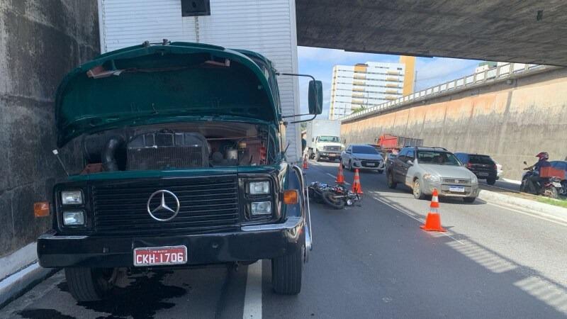 Um grave acidente envolvendo uma moto e um caminhão resultou em uma morte e deixou outra pessoa gravemente ferida em João Pessoa, nesta terça-feira (21). A colisão traseira ocorreu no sentido Cabedelo, no Km 17 da BR-230, próximo ao viaduto da Av. Epitácio Pessoa.